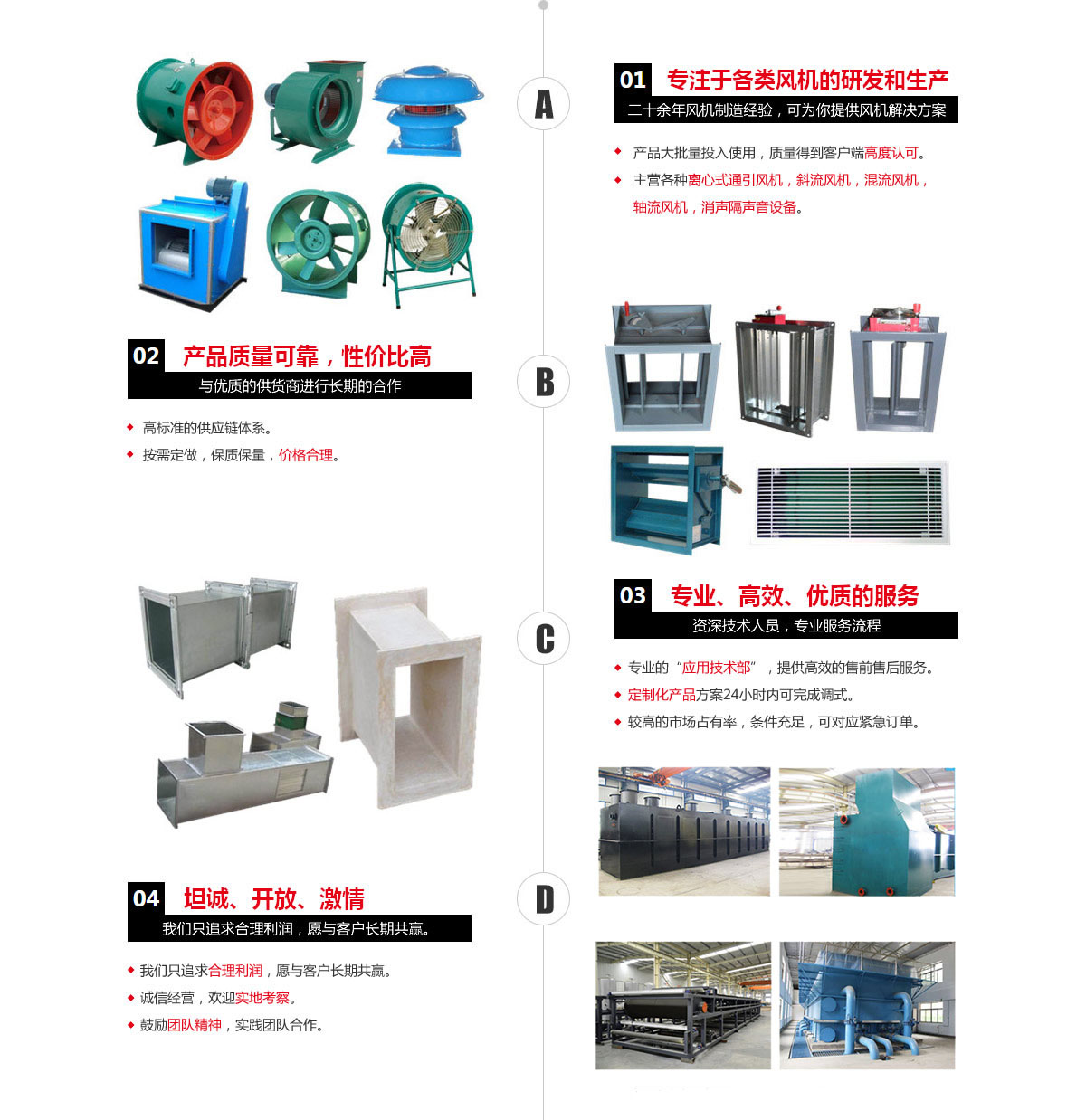 本公司專業(yè)生產各種離心式通引風機,斜流風機,混流風機,軸流風機,軸流風機,不銹鋼排風機,全塑封機,高溫風機,消聲隔聲音設備,以及各種特殊用途的不銹鋼、鈦材、玻璃鋼、塑料及襯膠、貼瓷等不同材質的防腐、防爆和耐高溫的高效低能耗新型風機。同時生產各種水處理、消煙除塵、焚燒爐等環(huán)保設備設施。產品廣泛應用于鋼鐵、冶金、醫(yī)藥、化工、紡織、煤礦、市政等各行業(yè)。